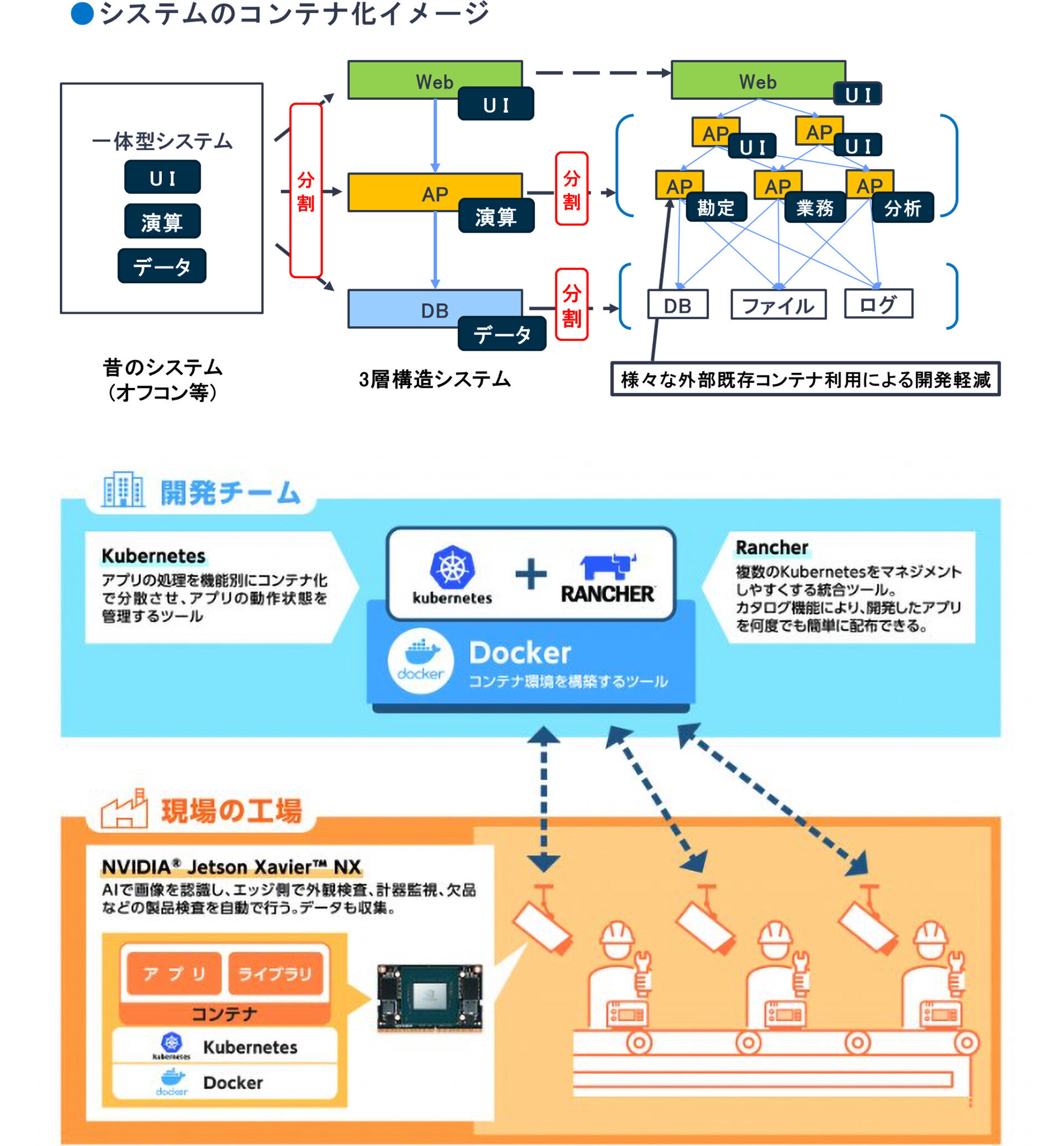 - デバイスには小型・高性能・低消費電力・低価格なJetson Xavier NXを提案。複数のデバイスを管理するツールとしてKubernetesとその運用基盤であるRancherも導入し、使い方のレクチャーや導入後のサポートも対応