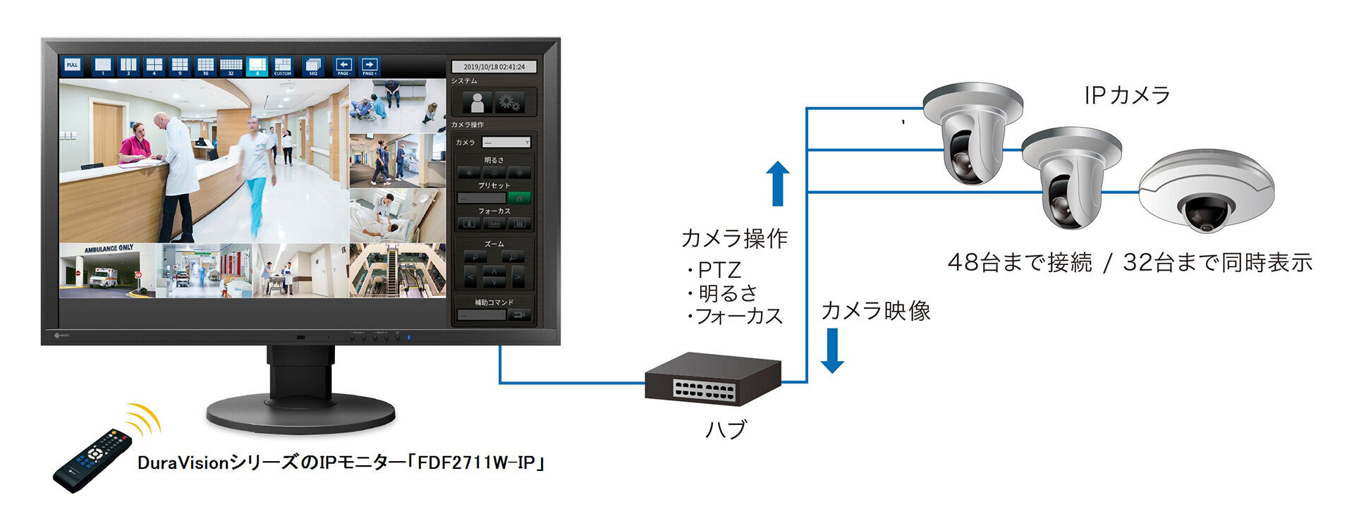 IPソリューションの最新機種は、ボックス型で外部ディスプレイに接続して利用するタイプの「DX0211-IP」と、27型ディスプレイと一体型になった「FDF2711W-IP」の2機種だ。特徴は、最大で4K(3840×2160)の高解像度な映像信号を入力可能なほか、最大48台の監視カメラを登録して最大32台分の映像をひとつの画面に同時表示できる。