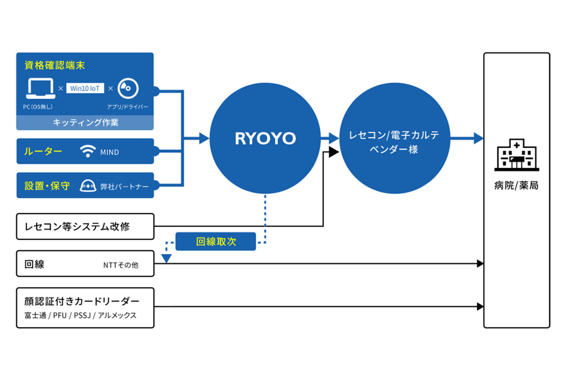 2023年4月、マイナンバーカードのICチップや健康保険証の記号番号などを用いて、オンラインで保険資格情報の確認ができる「オンライン資格確認」の原則義務化がスタートした。2024年12月には従来の保険証の新規発行が停止し、本格的にマイナンバーカードが健康保険証の役割を代替することとなる。リョーサン菱洋は、医療機関向けのITシステム構築を行っているシステムベンダーに「オンライン資格確認導入支援サービス」を提供している。オンライン資格確認では、健康保険に関する受診者の資格情報をオンラインで確認し、その結果を医療機関のITシステムに反映する。従って医療機関だけでは導入が難しく、システムベンダーとの連携が必要だ。このたびリョーサン菱洋は医療機関にITシステムを提供する株式会社IDKと連携して、那珂記念クリニック(医療法人健清会、茨城県那珂市)にオンライン資格確認システムの導入支援を行った。
