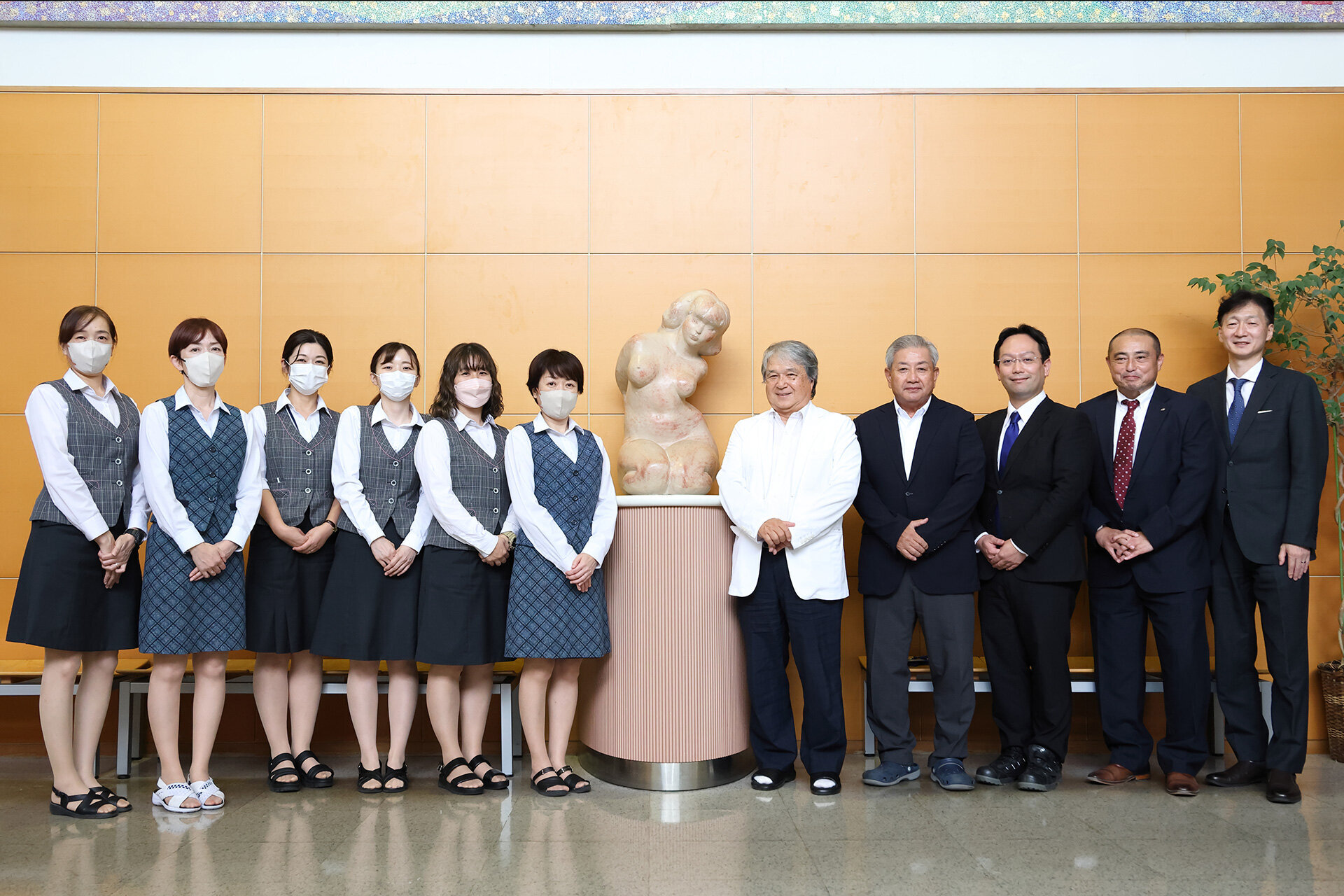 (左側:受付担当の皆様、右側中央から:遅野井院長、飯村事務長、伊藤氏、IDK谷氏、リョーサン菱洋金澤)