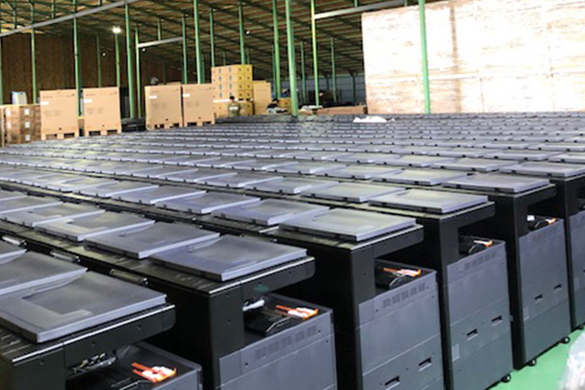 また、キッティング作業を行うための場所の確保も重要だ。大型のマルチコピー機を一度に大量に保管しつつ、同時にキッティングするだけのスペースも確保しなければならない。そこは作業会社の協力のもと、200坪と50坪の2つの倉庫を借りてキッティング作業に当たることができた。