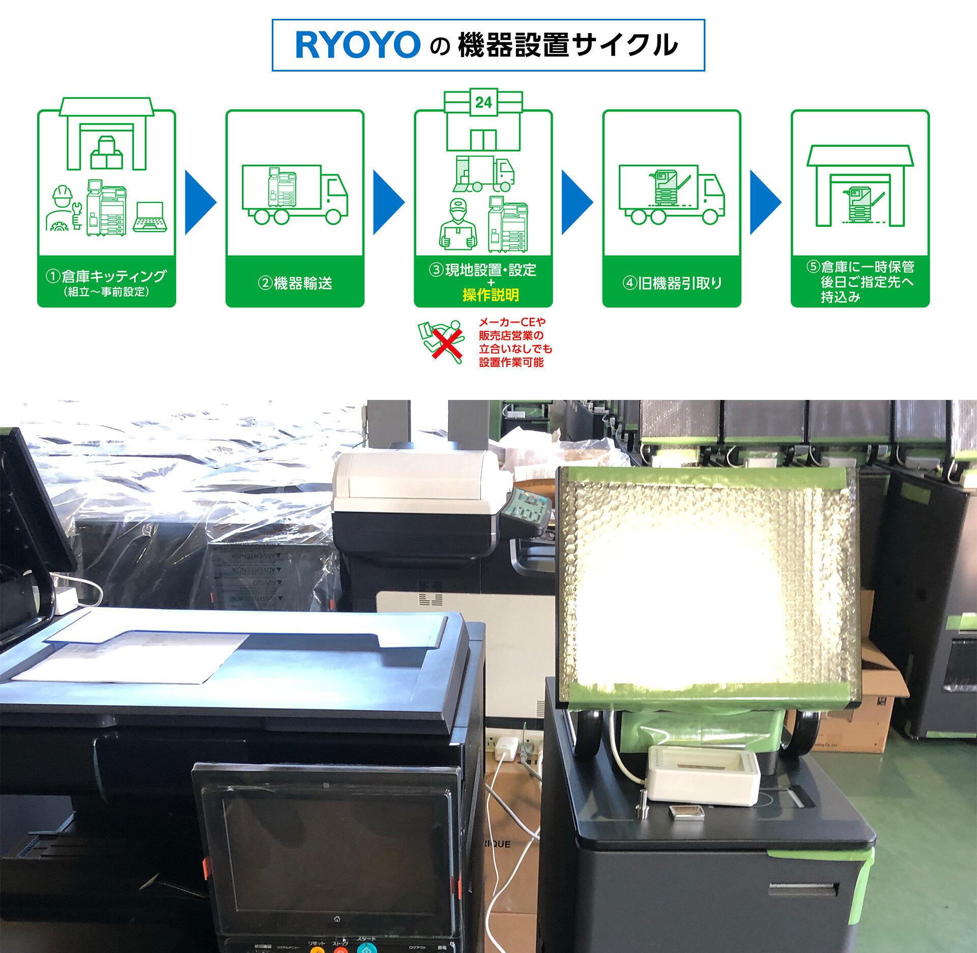 そんななか、リョーサン菱洋の果たす役割は、販売代理店としての営業活動だけではない。案件によっては、お客様の元へのマルチコピー機の設置を請け負うこともある。